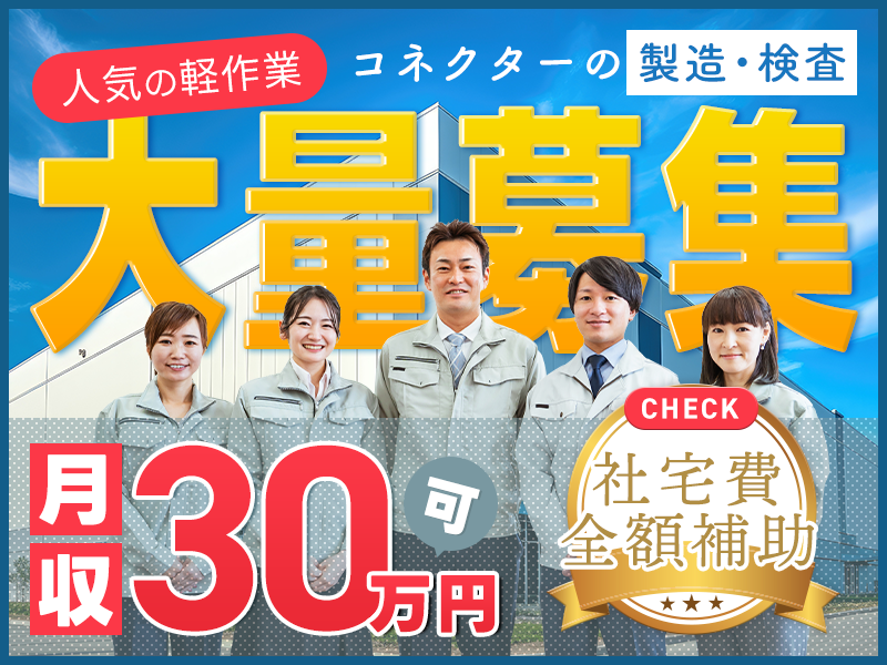 社宅費全額補助◎月収30万円可!未経験OK♪コネクターの製造・検査!人気の軽作業メイン