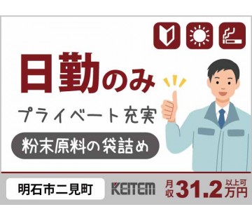 【粉末原料の袋詰め】3日ごとに休日あり/日勤でも高収入/残業少なめ/正社員登用あり/月収31.2万円