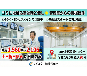 【仕事内容】 クリーンセンターでの管理室での運転管理のお仕事 【具体的には・・・】 *中央管理室における運転管理及び天井走行クレーン(3t)を操作  しゴミピットから焼却炉ホッパーにごみを投入する仕事です。 *1日200t~240tのゴミを焼却処分する迫力ある職場です。 *クレーンの運転は入社後講習にて操作可能です。したがって未経験の方でも十分ご活躍いただけます。 その他、機器類の保全修理などの作業もありますがいずれも未経験でも可能です。 【このお仕事のおすすめポイント】 ①直接ゴミに触るなどの作業はほとんどなく、綺麗な管理室から運転管理をするお仕事になります。 └汚い作業をするイメージを持たれる方が殆どですが、真逆です! ②50代~60代がメインに活躍中 └50代からこの仕事を始める方が多く、近い年齢層の方で仕事をするので働きやすいです! ③重労働ではないのに時給1560円 └重い物を持つ、危険物を扱う、外での作業ではないですが、高時給なのでしっかり収入を得られます! 仕事は当社から荏原環境プラント(株)への派遣です。 現在10名の当社社員が勤務中です。 【荏原環境プラントのご紹介】 荏原環境プラント(株)は(株)荏原製作所の100%子会社で、主に全国の自治体向けに焼却炉プラントの設計・建設・運転管理を請け負う会社です。 社員のみなさんは紳士的で優しく指導してくれますので安心してください。 ◎60歳以上活躍中!