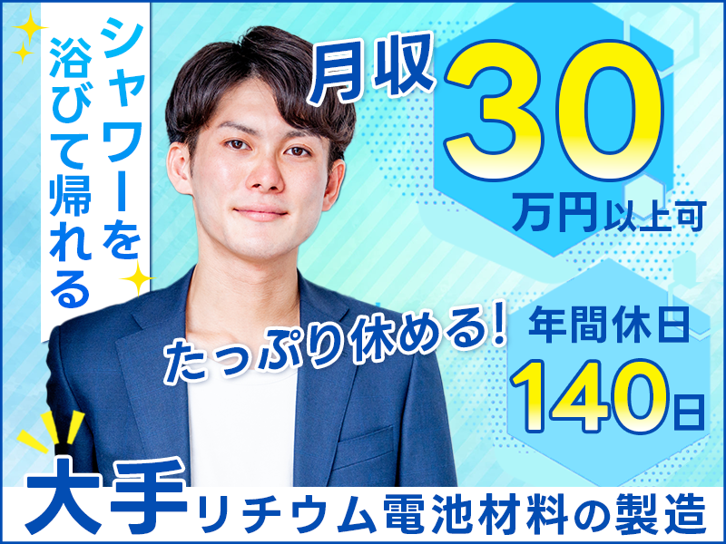 12月入社で祝金5万円★【月収30万円以上可!】シャワーを浴びてから帰れる♪リチウム電池材料の製造!社宅費補助あり♪【履歴書不要☆オンライン面接OK】【入社キャンペーン実施中!】