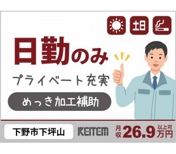 土日休み 【鉄のめっき加工補助】 20~30代活躍中/資格があれば時給UP/日勤のみ/未経験歓迎のサポート/月収26.9万円