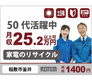 【家電のリサイクル】時給1400円のコツコツ分解作業/土日祝休み/未経験OK/日勤or夕勤選べる/月収25.2万円
