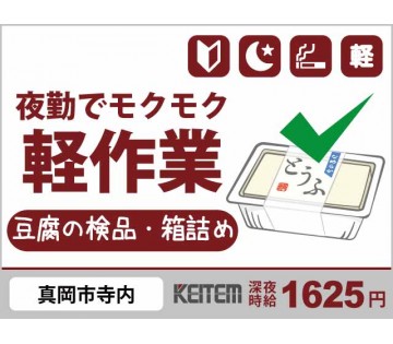 【豆腐の検品・箱詰め】深夜時給1625円/夜勤でモクモク軽作業/残業0/基本3日毎に休日/月収23万円