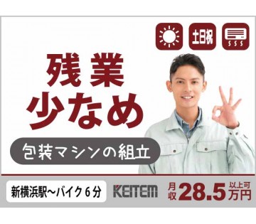 【包装マシンの組立】『日勤&残業0で月収28.5万円可』#装置の組立経験必須 #20~40代活躍中#土日祝休み #長期休暇年3回 #交通費支給#新横浜駅近く #日払いOK #喫煙所完備≪月収28.5万円≫20~40代活躍中!