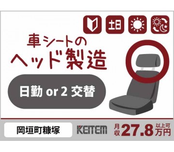 【車シートのヘッド部分製造】選べる日勤or2交替シフト/土日休み/未経験OK/冷暖房完備/工場見学実施中/月収27.8万円