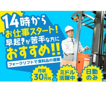 お仕事ナンバー5391/14時からお仕事スタート!早起きが苦手な方におすすめ[どんな会社]会社設立から30年以上!商品の調達から配送、在庫管理、物流企画まで、物流全般を総合的に手がける企業です。[仕事内容]リーチリフトに乗って食料品の運搬作業【STEP1】フォークリフトに乗って、倉庫内のラックに保管されている商品を取り出します。【STEP2】商品にキズなどが無いかをチェックし、問題なければ行き先ご...