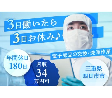 【最短当日入寮OK!】3日働いたら3日お休み!年間休日180日以上!電子部品の交換・洗浄作業★空調25℃設定のクリーンルーム★月収34万円可★