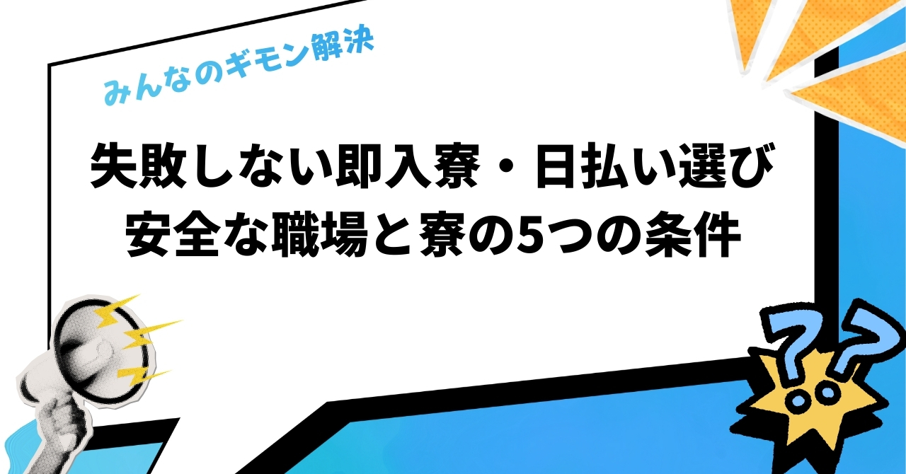 「今すぐ働きたい、住む場所も確保したい」という切実なニーズをお持ちの方にとって、「即入寮・日払い」の仕事は新しい生活の大きな一歩となる選択肢です。しかし、「すぐにお金は欲しいけれど、危ない仕事や劣悪な環境は避けたい」という不安も同時に抱えているのではないでしょうか。この記事では、そのようなあなたの不安に寄り添い、安全で安心して働ける職場と快適な寮を見つけるための具体的な方法を詳しく解説します。
