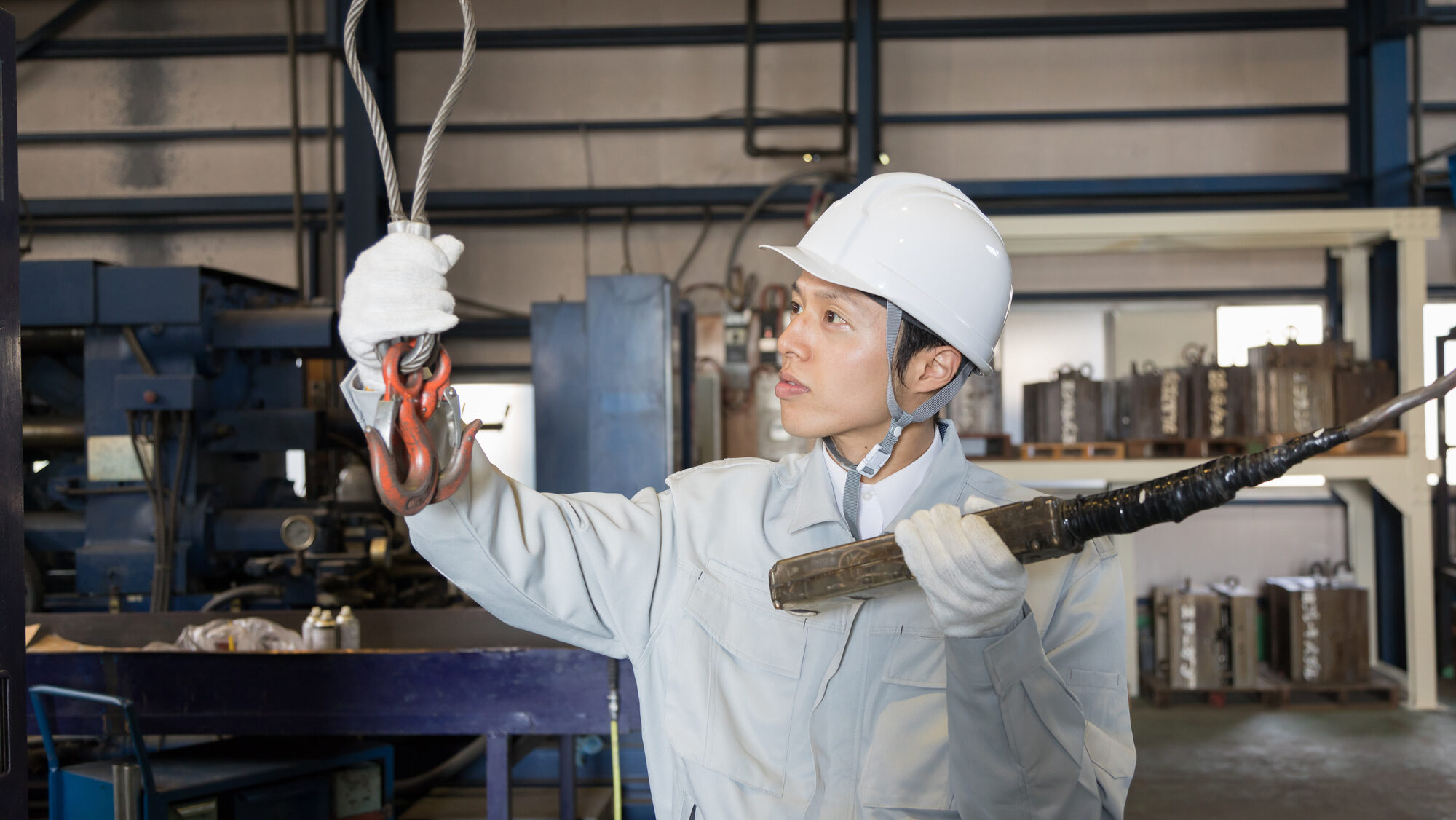 基本的な重量物の移動はクレーンが行うため、腕力よりも「手順を守る正確さ」や「安全確認」が重視されます。ただし、ワイヤーロープなどの道具自体がある程度重い場合があるため、基礎的な体力は必要です。