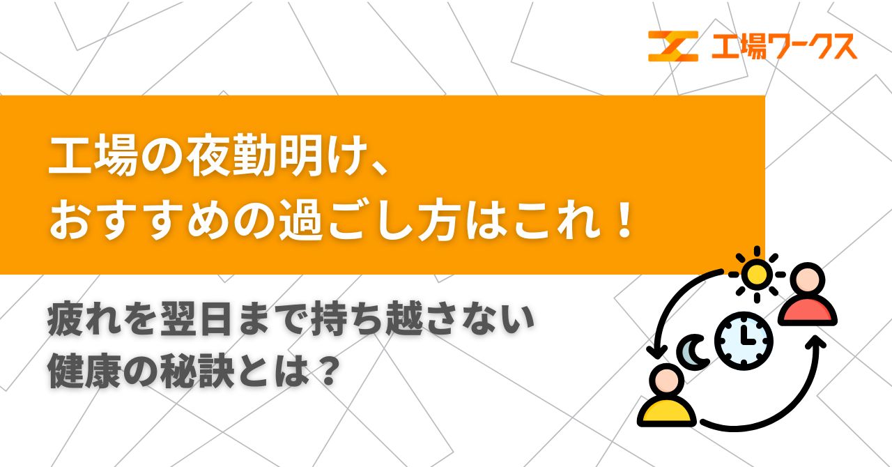 工場で勤務している方の中には、夜勤があるという方も多いでしょう。なかには、なかなか夜勤明けの上手な過ごし方が分からなくて、どうしても疲労がたまってしまう方も多いのでは?日勤に比べ生活全体が夜型になりがちな夜勤では、夜勤明けのプライベートの時間を上手に過ごすことが、長期的に勤務を続ける上でも不可欠なんです。