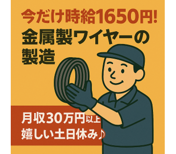 \高時給1650円スタート!未経験歓迎/ 【クルマ用タイヤの金属ワイヤー加工補助】 月収30万円以上可能│資格取得支援あり│3交替勤務│土日休み│定食280円