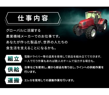 未経験OK!/月収例37.8万円/\ご入社後全員に 祝金55万円支給/【大手メーカーで工具を使ったてトラクターの組立】(No.TB-10024-04-JP)