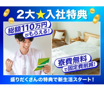 入社特典3年満期で最大合計総額110万円+寮費無料の豪華特典が付きます☆